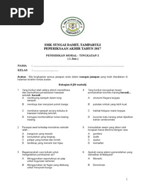 Full PDF Package Download Full PDF Package. SMK TAMAN UNIVERSITI 2 PEPERIKSAAN AKHIR TAHUN PENDIDIKAN MORAL TINGKATAN 1 NAMA_____ TINGKATAN. _____ TINGKATAN_____ Bahagian A Setiap soalan diikuti oleh empat pilihan jawapan.